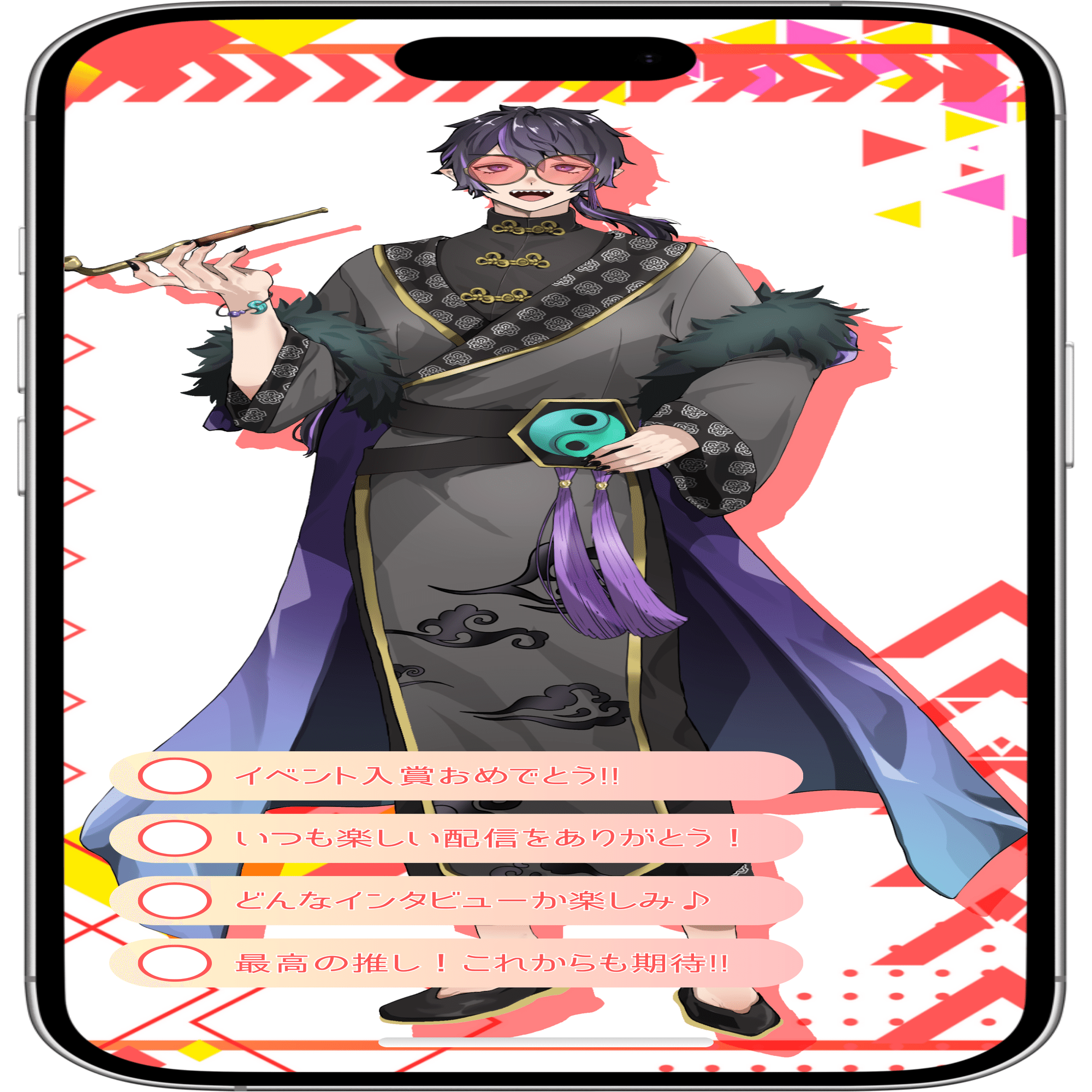 立ち絵は自分の好きを詰め込みました。 タレ目、つり眉、下まつげ、ギザ歯、尖り耳、紫メッシュ、長髪、黒ネイル、チャイナ服、煙管、配信では外してるけど丸サングラス……どれか一つでも刺さった人はぜひ🫵